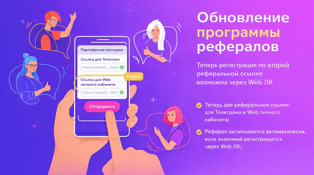 Раньше пригласить нового пользователя можно было только через Telegram-бота — реферал регистрировался по ссылке и активировал бонус в боте. Теперь в разделе Партнёрская программа появилась вторая ссылка — для тех, кто регистрируется через Web личный кабинет.