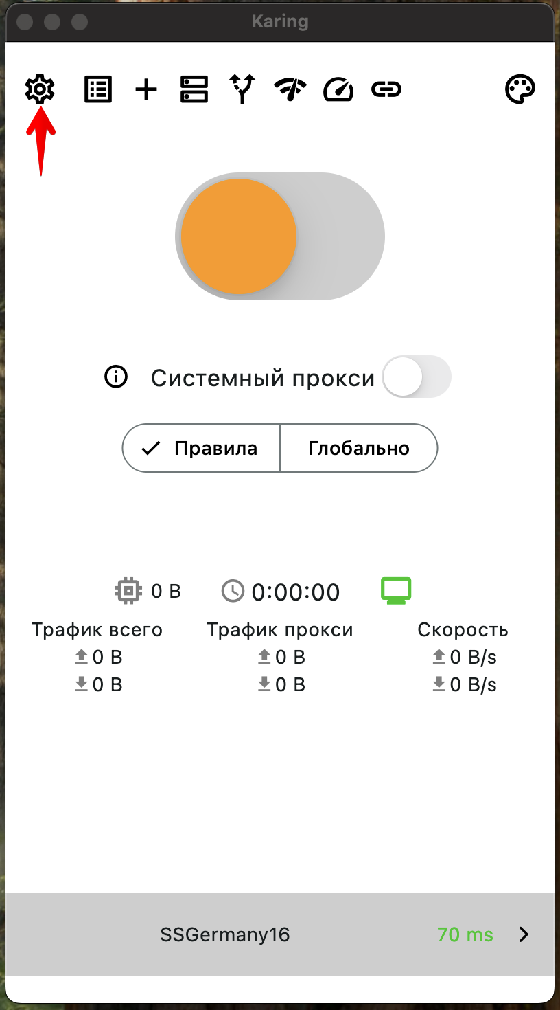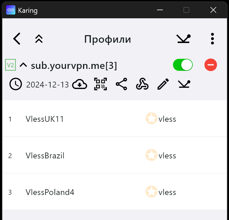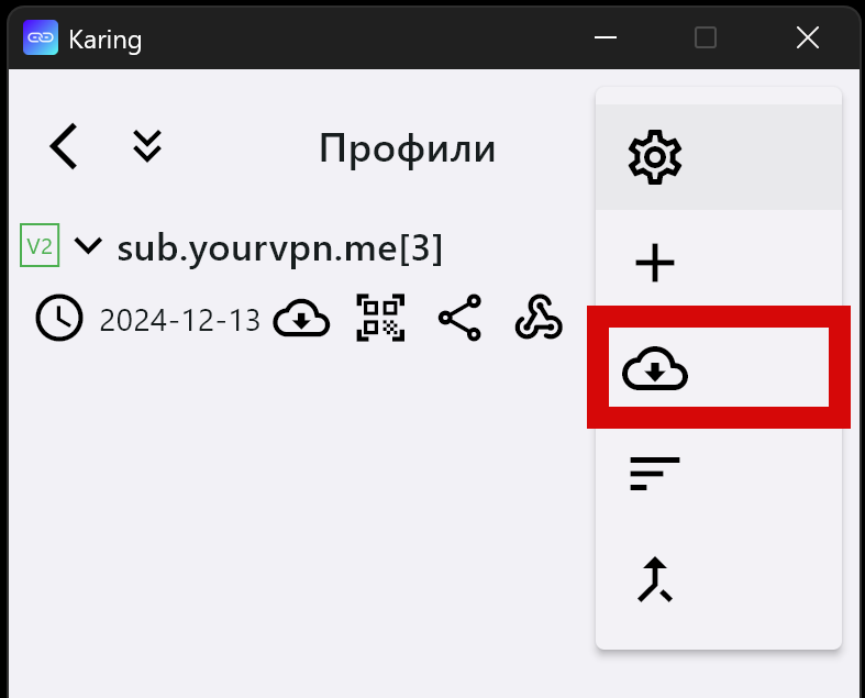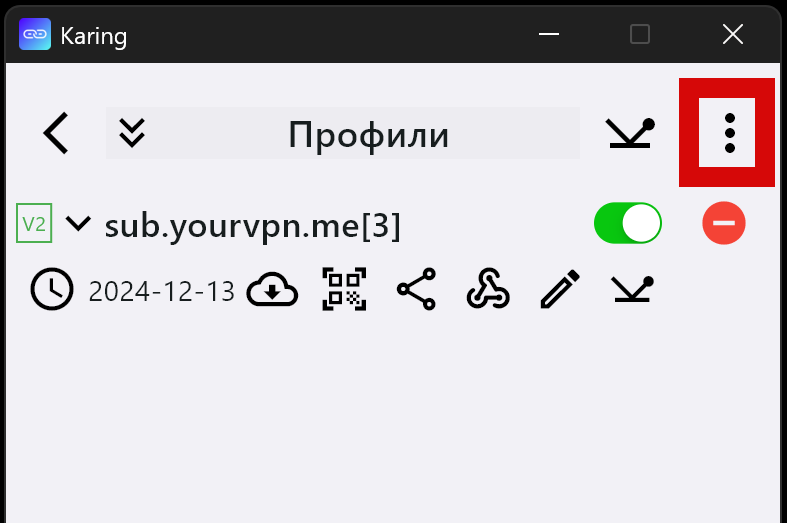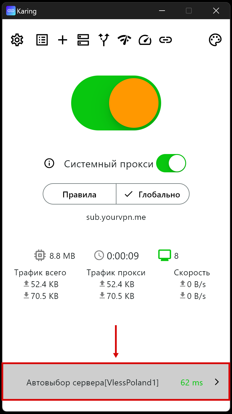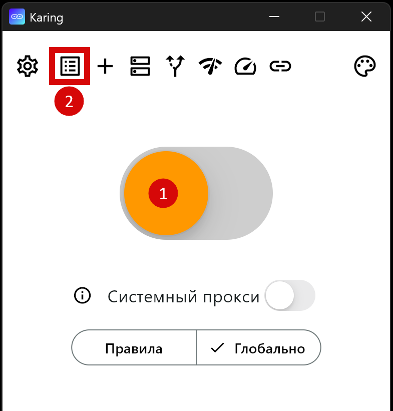 - Запустить приложение “Karing” (на Windows от имени Администратора)