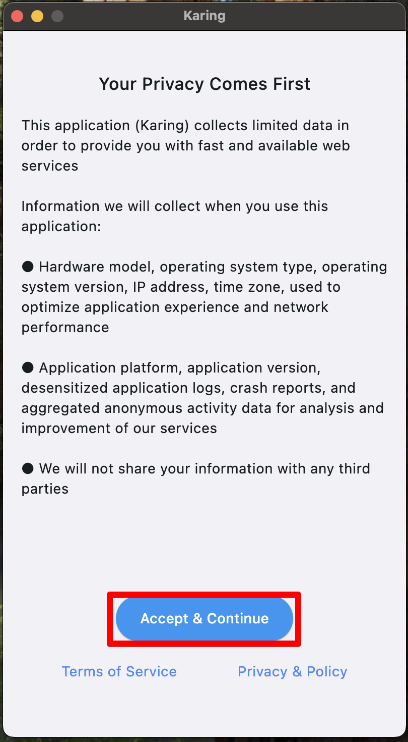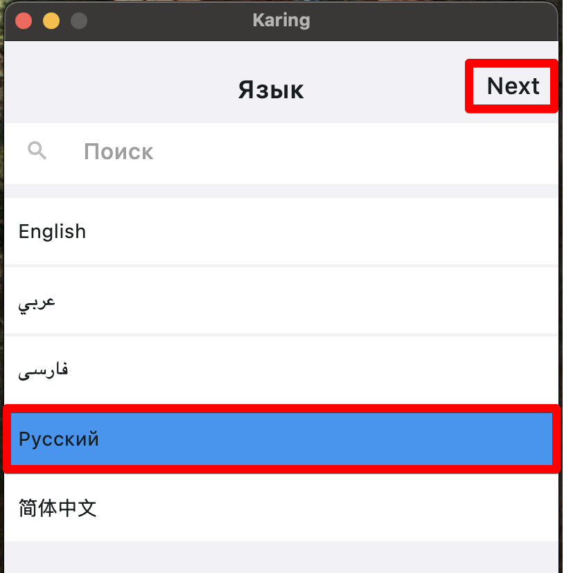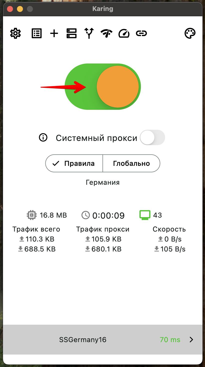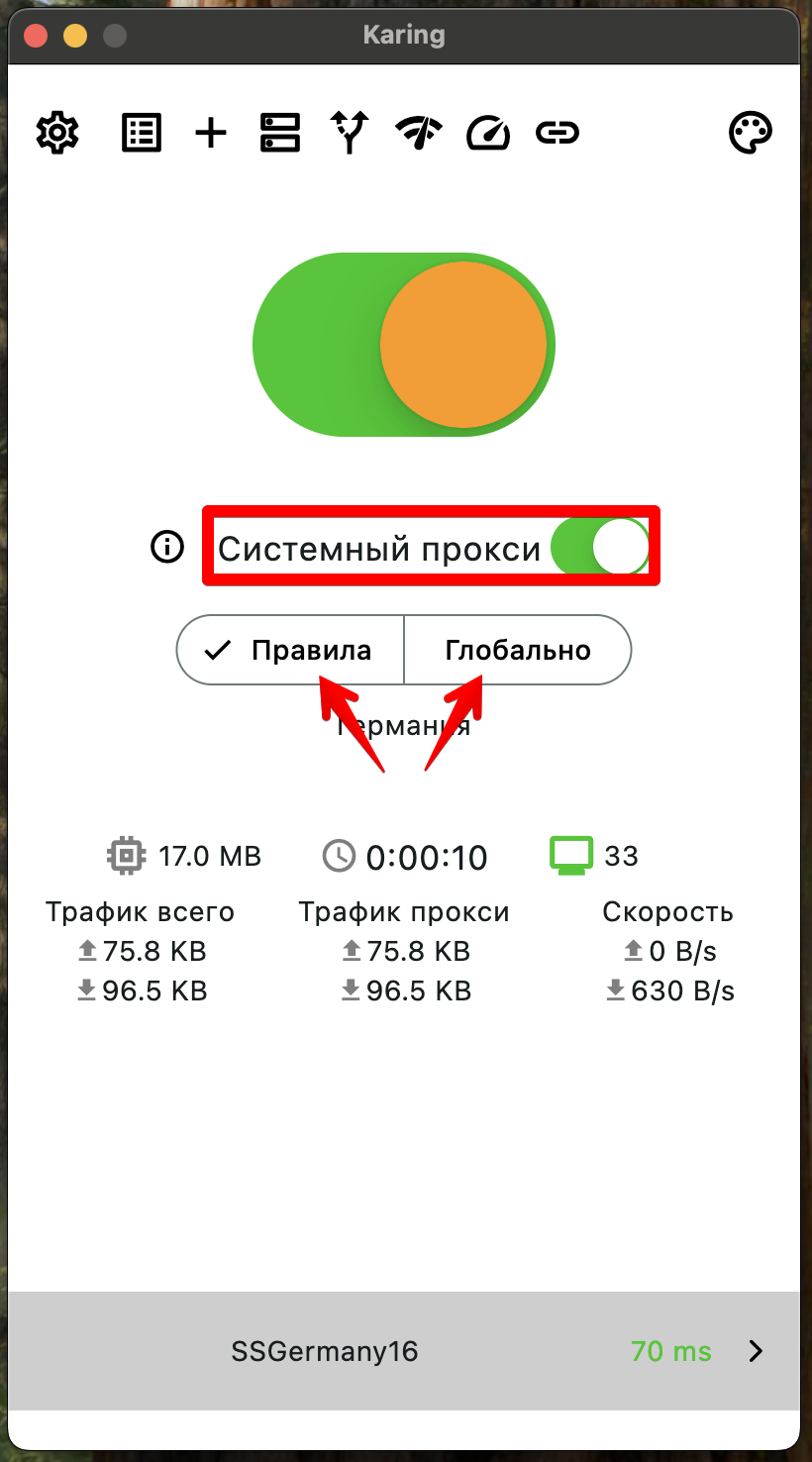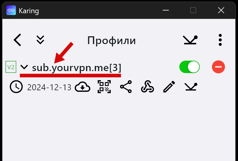 - Запустить приложение “Karing” (на Windows от имени Администратора)