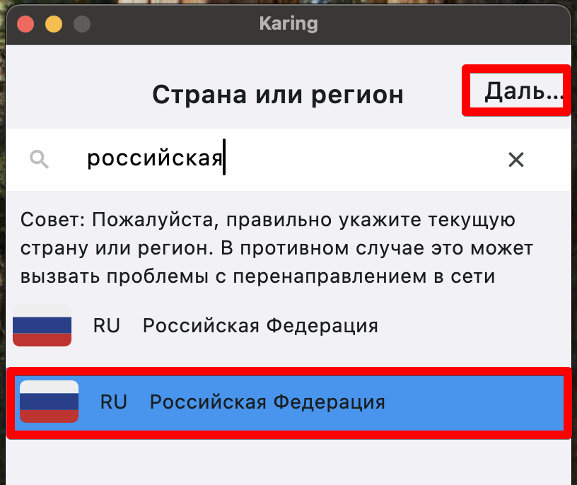 - В разделе “Страна или регион” найти и выбрать страну “Российская Федерация”, нажать “Даль…”