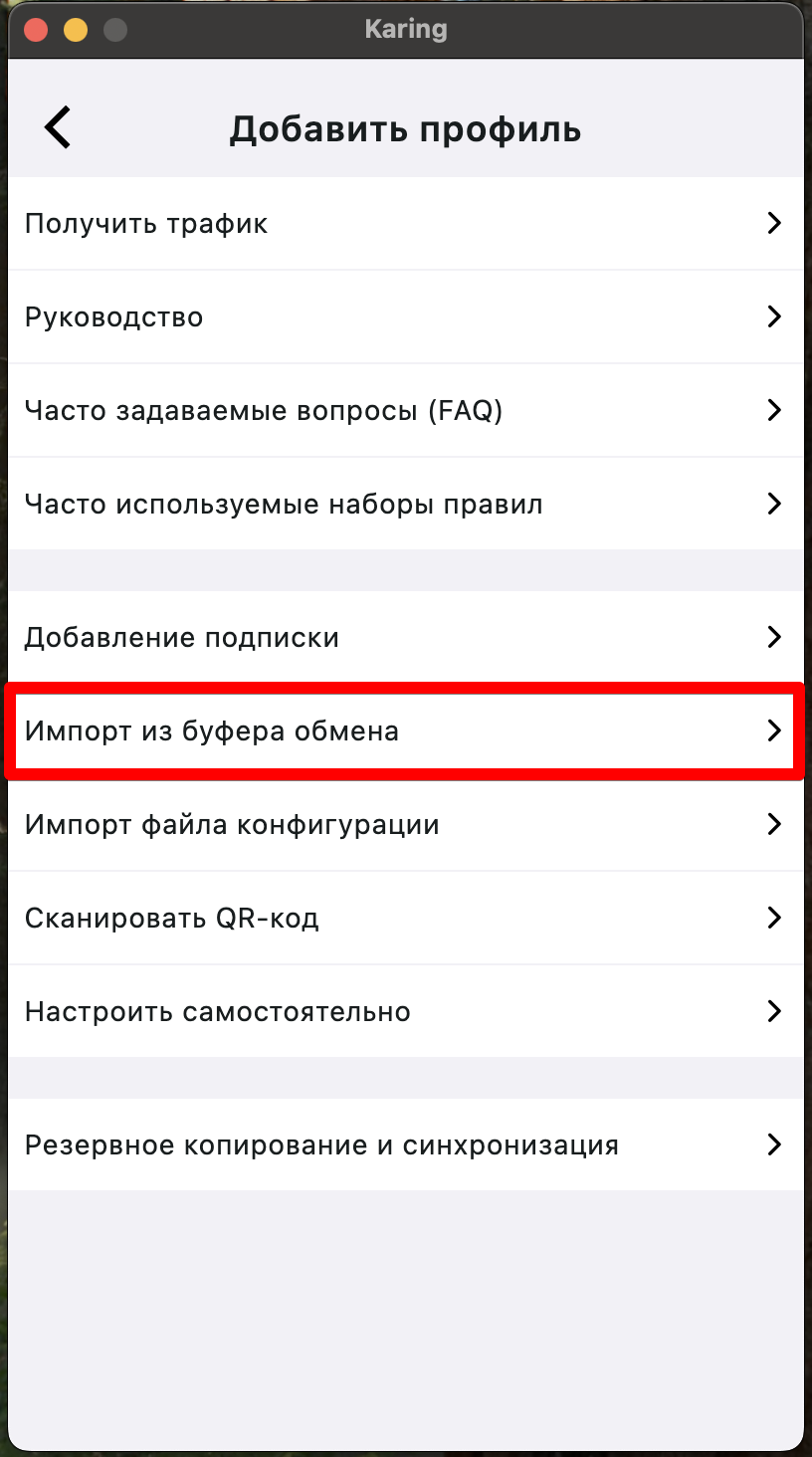 - В разделе “Добавить профиль” нажать “Импорт из буфера обмена”, затем вверху экрана нажать на галочку и “Ок” в появившемся окне