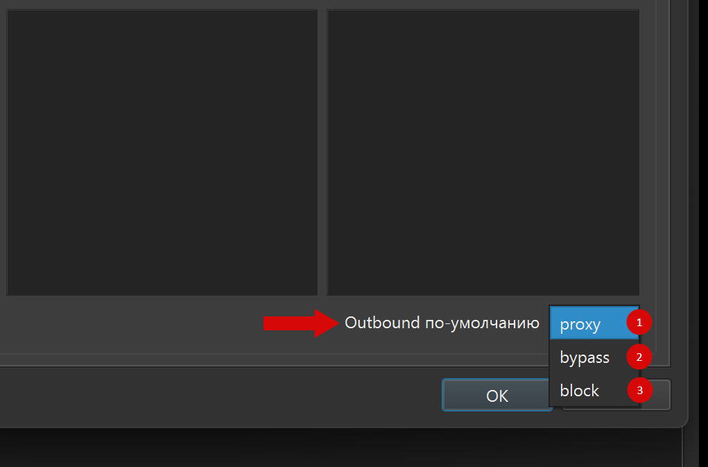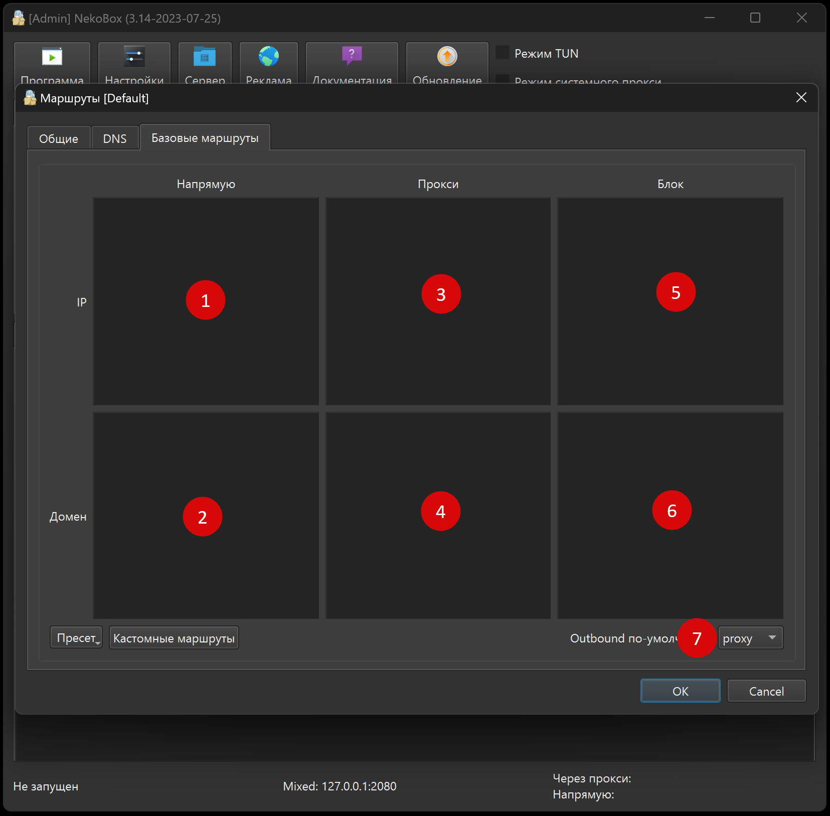 В правом нижнем углу находится переключатель “Outbond по-умолчанию” (7), он отвечает за то, как работает приложение с теми ресурсами, которые не указаны в квадратах выше (с 1 по 6):