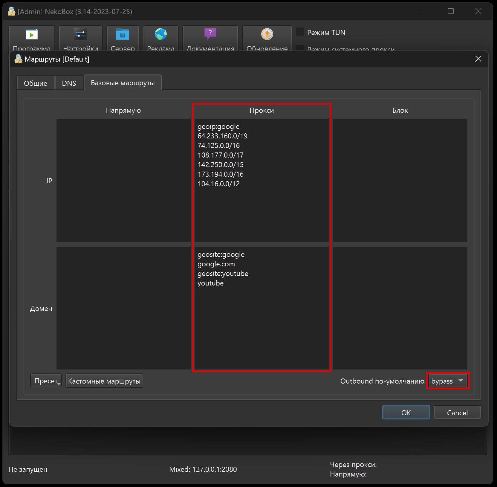На скриншоте ниже пример настройки приложения Nekoray, при которой через ВПН работает только YouTube и Google, а все остальные ресурсы напрямую (без ВПН)В столбце “Прокси”, и в строках “IP” и “Домен” указали адреса нужных ресурсов (YouTube и Google), а переключатель “Outbound по-умолчанию” поставили в режим “bypass” (напрямую)