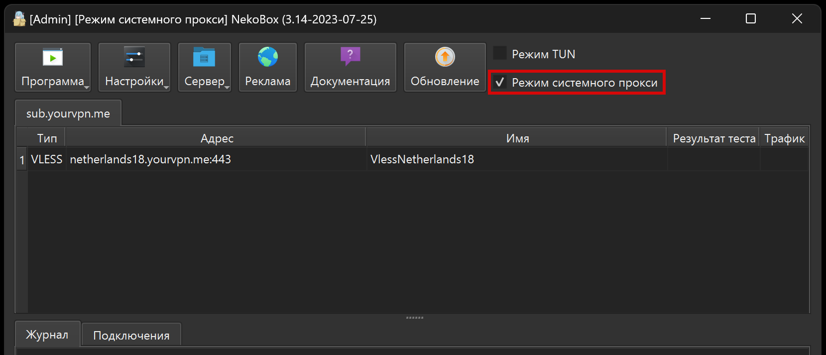 Режим работы приложения должен быть выбран “Режим систенмного прокси”