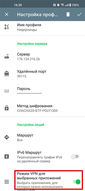 Теперь только выбранные приложения будут использовать VPN, а остальные будут работать напрямую. Эта настройка значительно экономит заряд батареи. Если выбрано только 1-2 приложения, возможно, вам даже не нужно будет выключать VPN.