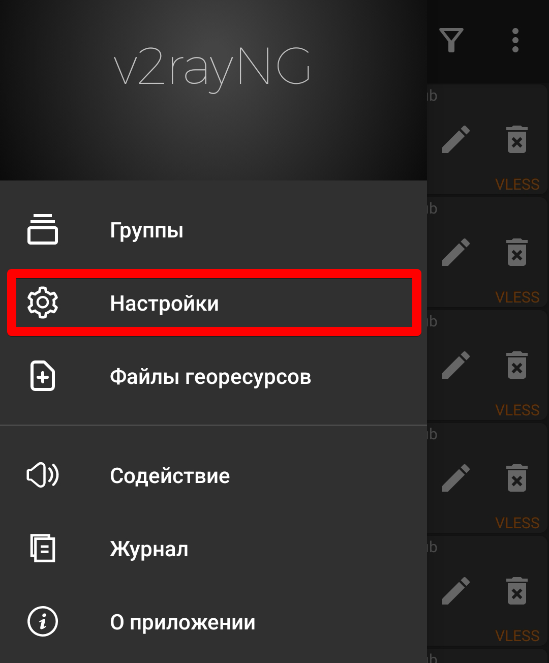 - Открыть ВПН-приложение v2rayNG и перейти в раздел с настройками
