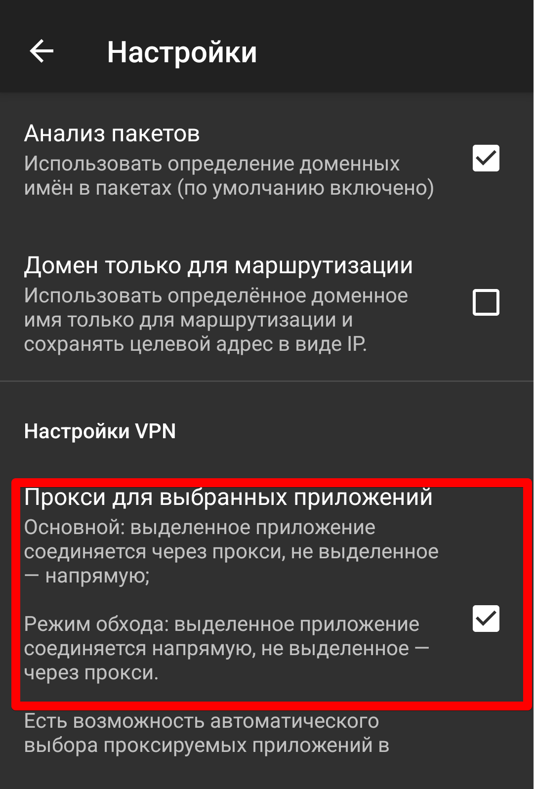 - Выбрать пункт “Прокси для выбранных приложений”, затем открыть его