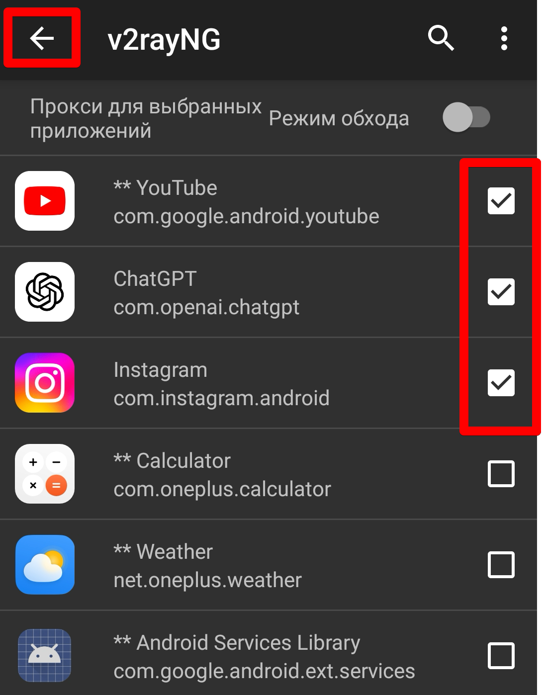 - Выбрать нужные приложения - те, которые должны работать через ВПН, затем выйти из настроек