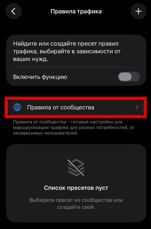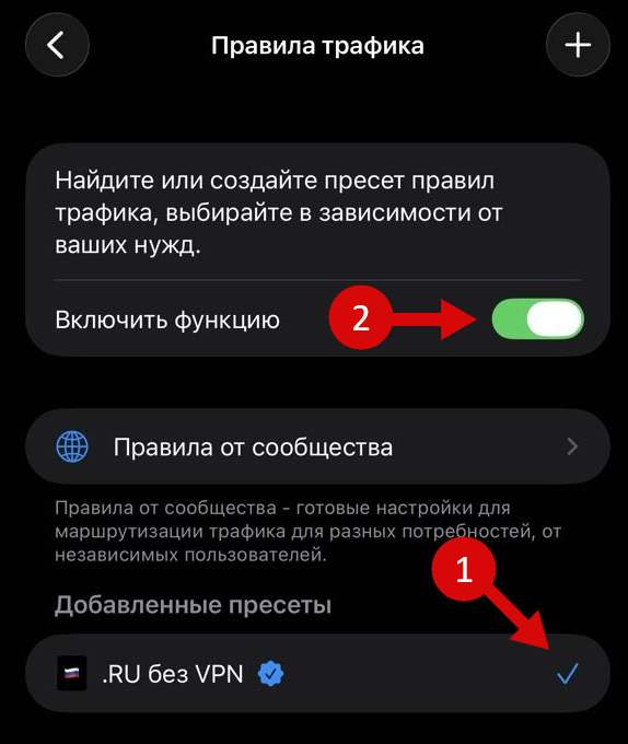 Вернуться в раздел Правила трафика и включить переключатель Включить функцию. В блоке Добавленные пресеты выбрать нужный пресет — он станет активным