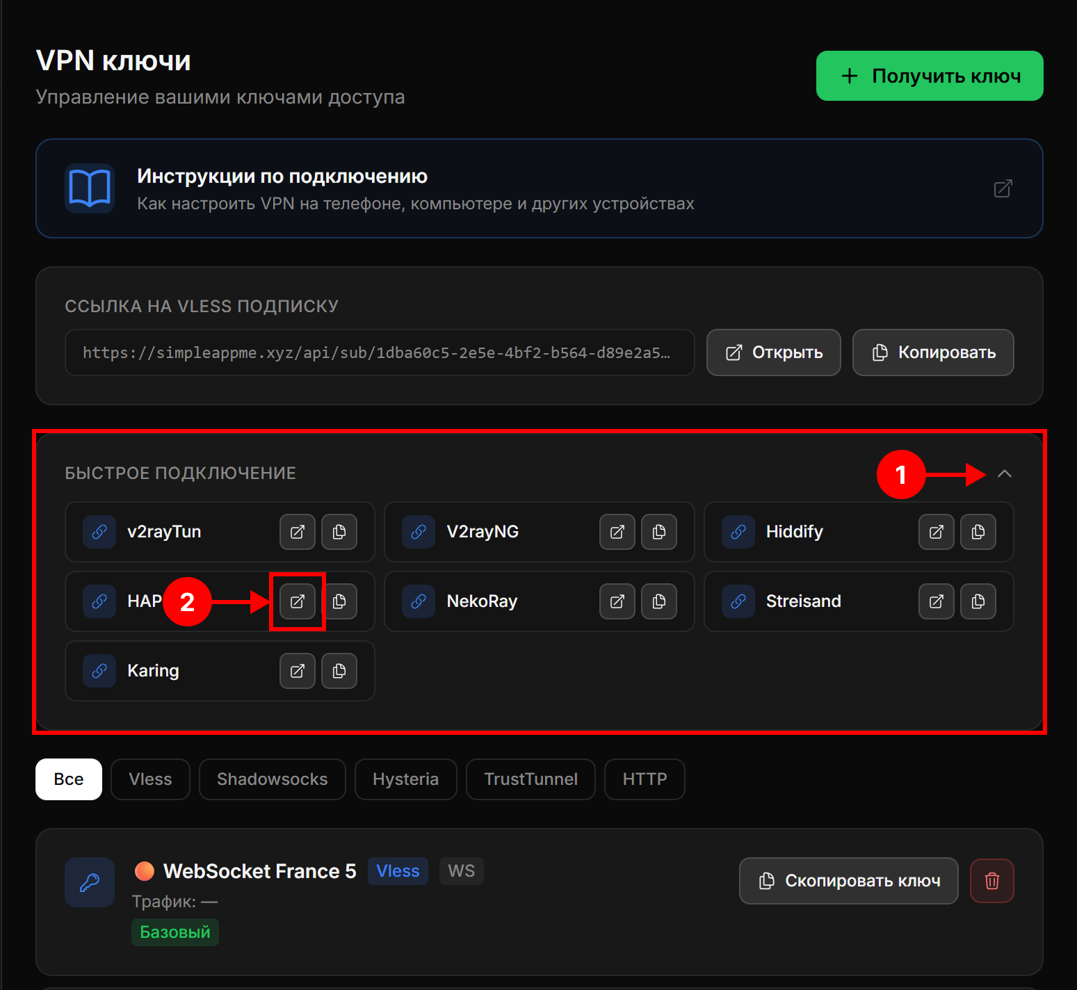 В разделе «Мои ключи» раскрыть блок «Быстрое подключение». В нём перечислены поддерживаемые VPN-приложения. Нажать кнопку «Открыть» напротив нужного приложения — подписка автоматически добавится в приложение.